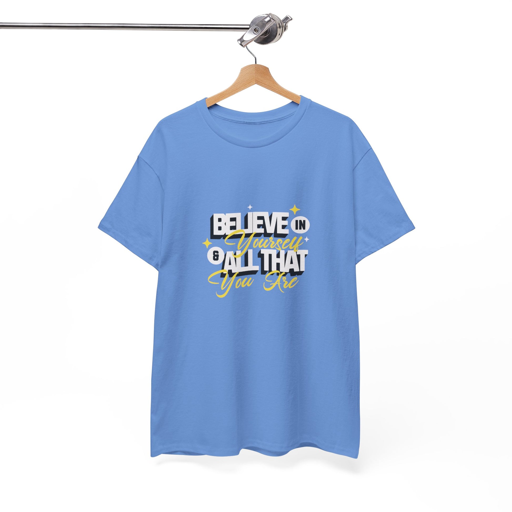 Introducing our unisex heavy cotton tee, designed to inspire confidence and positivity! This vibrant shirt features a motivational quote that encourages wearers to believe in themselves, making it ideal for those seeking a daily boost of encouragement. It's perfect for casual outings, workouts, or simply lounging at home while staying stylish! \n\nCrafted for adults, this tee is not only a great gift for birthdays, graduations, or any celebration but also serves as a wonderful reminder during holidays such as New Year’s resolutions, Mental Health Awareness Month, or any event focusing on self-improvement and empowerment. Embrace comfort and style while promoting a positive mindset in your wardrobe!